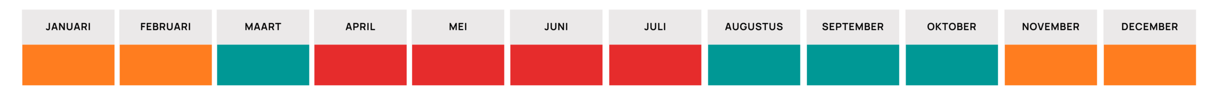 | Januari | Oranje | Februari | Oranje | Maart | Groen | April | Rood | Mei | Rood | Juni | Rood | Juli | Rood | Augustus | Groen | September | Groen | Oktober | Groen | November | Oanje | December | Oanje |